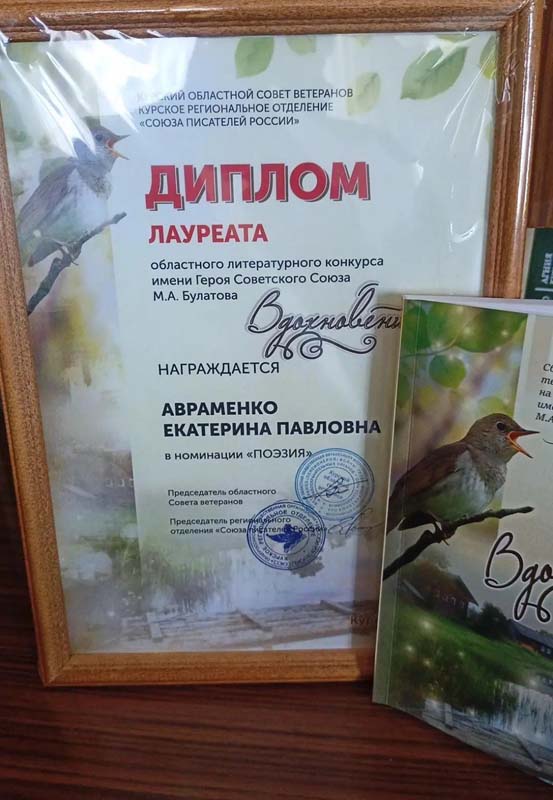 Екатерина Павловна награждена дипломом лауреата областного литературного конкурса «Вдохновение» в номинации «Поэзия». И это не единственное награждение.