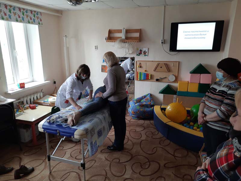 Занятие с социальными работниками в школе обучения навыков ухода за гражданами пожилого возраста и инвалидов.