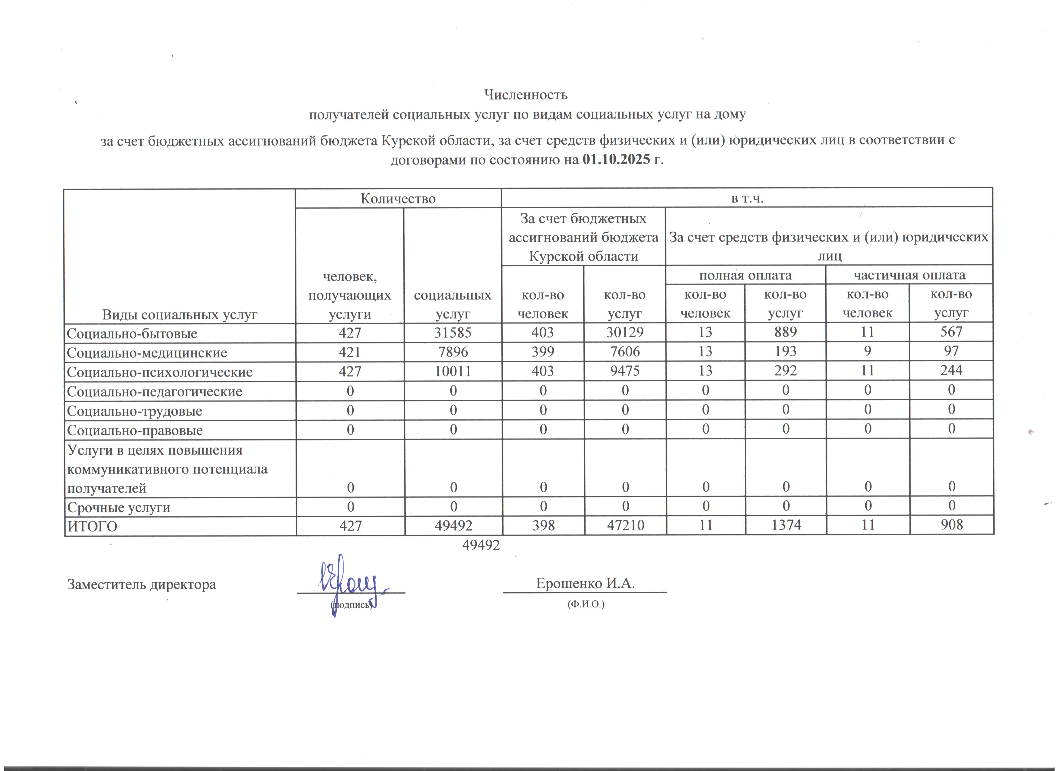 Численность получателей социальных услуг по видам социальных услуг на дому за счет бюджетных ассигнований бюджета Курской области, за счет средств физических и (или) юридических лиц в соответствии с договорами по состоянию на 01.10.2025 г.